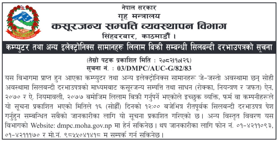 कम्प्युटर लगायत अन्य ईलेक्ट्रोनिक्स मालसामानहरु लिलाम बिक्रीको सिलबन्दी दरभाउत्र सम्बन्धी सूचना ।